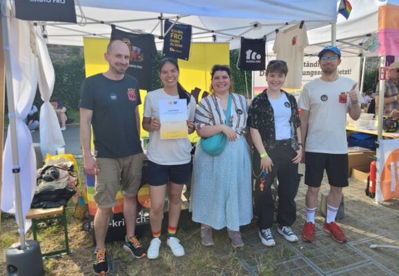 Radio FRO ging bei der Linz Pride Parade mit der Startnummer 13 mit. Wir freuen uns sehr, dass ihr uns bei unserer Fußgruppe vom Volksgarten bis zum Urfahraner Jahrmarktgelände begleitet habt. Wir haben gemeinsam ein Zeichen für Vielfalt, Toleranz und Offenheit in dieser bunten Stadt gesetzt. Und haben sogar die Urkunde für die kreativste Gruppe gewonnen! Vielen Dank dafür.